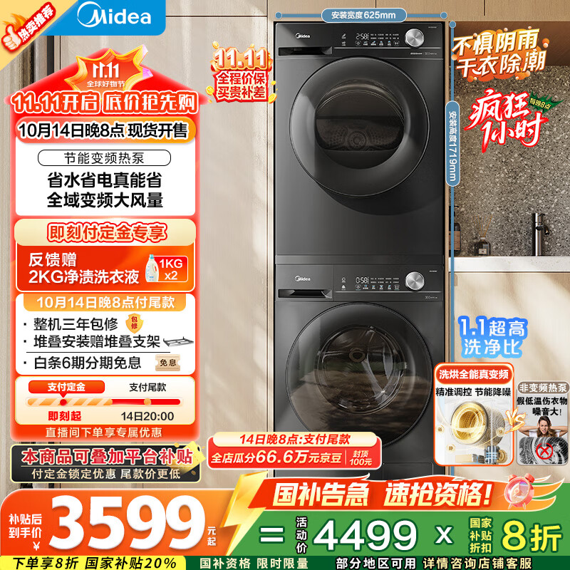 美的(Midea)洗烘套装 10KG滚筒洗衣机全自动+变频热泵烘干机家用烘衣服 1.1洗净比 MG100V36T+VH36T 国家补贴