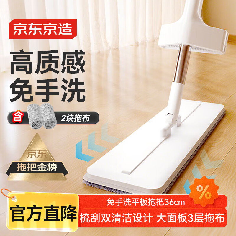 京东京造免手洗平板拖把36cm 家用拖地神器一拖净洗拖一体无水印 含拖布*2