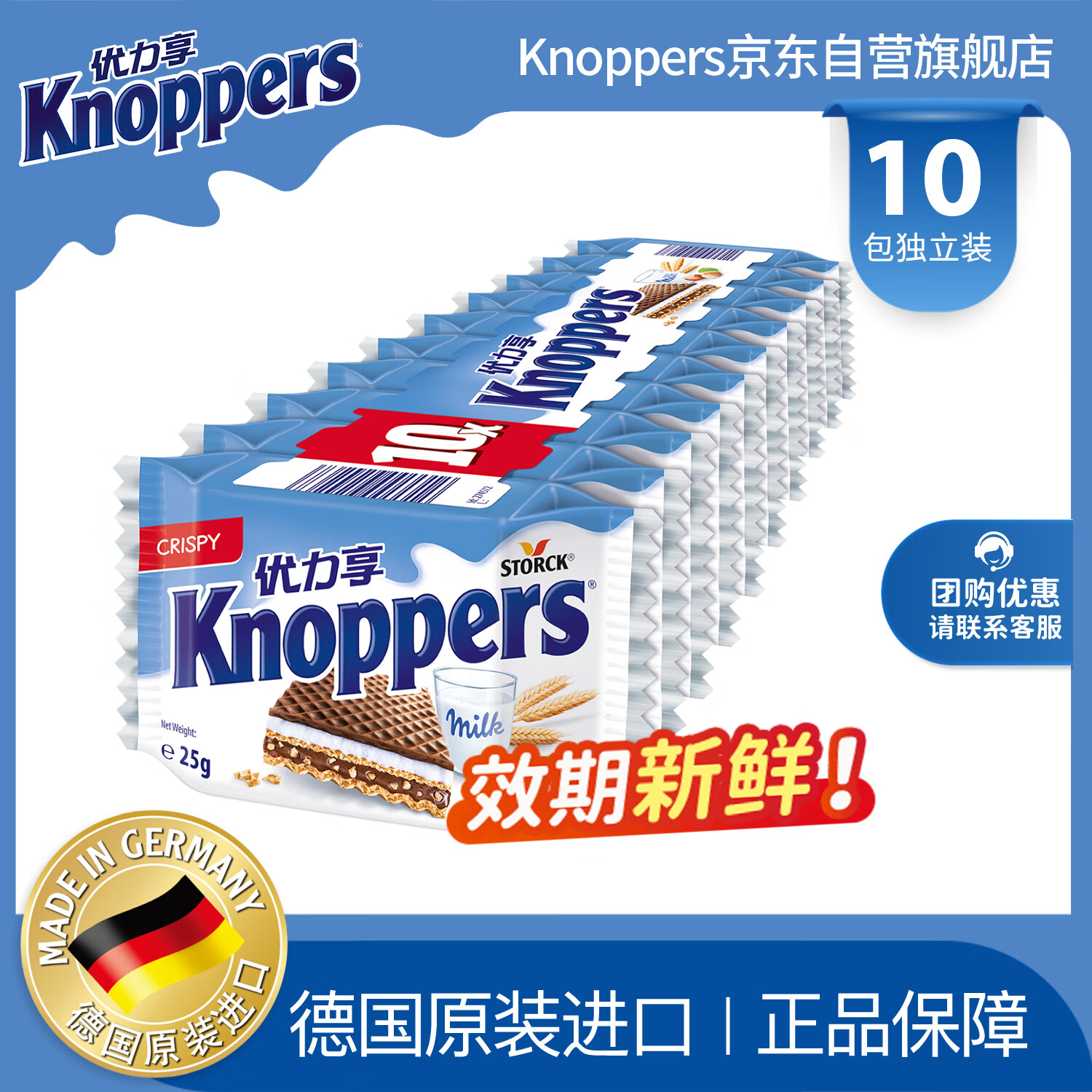 Knoppers优力享德国进口牛奶巧克力榛子威化饼干250g10片夹心饼干休闲零食