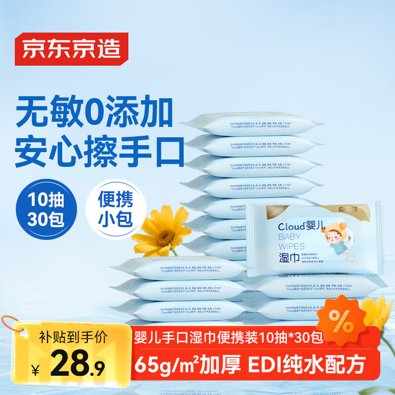 京东京造加厚65g婴儿手口湿巾10抽*30包 宝宝湿纸巾小包便携装 整箱