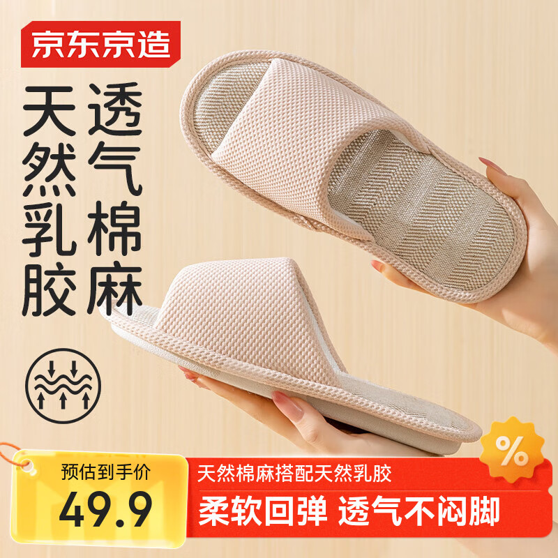 京东京造【天然乳胶】棉麻透气拖鞋秋冬情侣新款拖鞋女士燕麦色37-38
