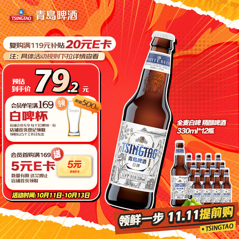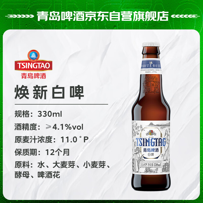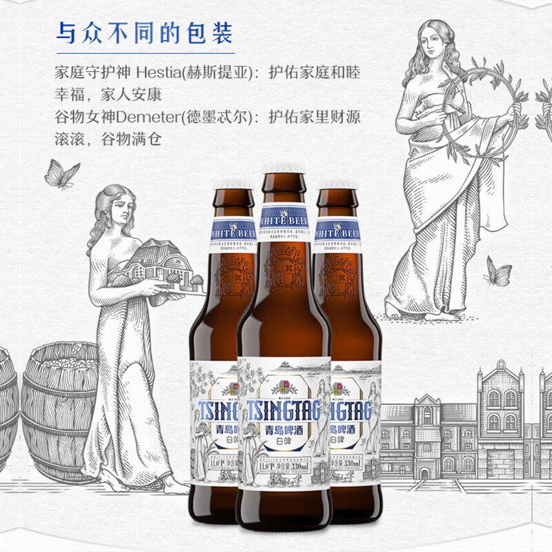青岛啤酒(TsingTao)精酿白啤 全麦酿造 330ml*12瓶 整箱装 双十一热卖