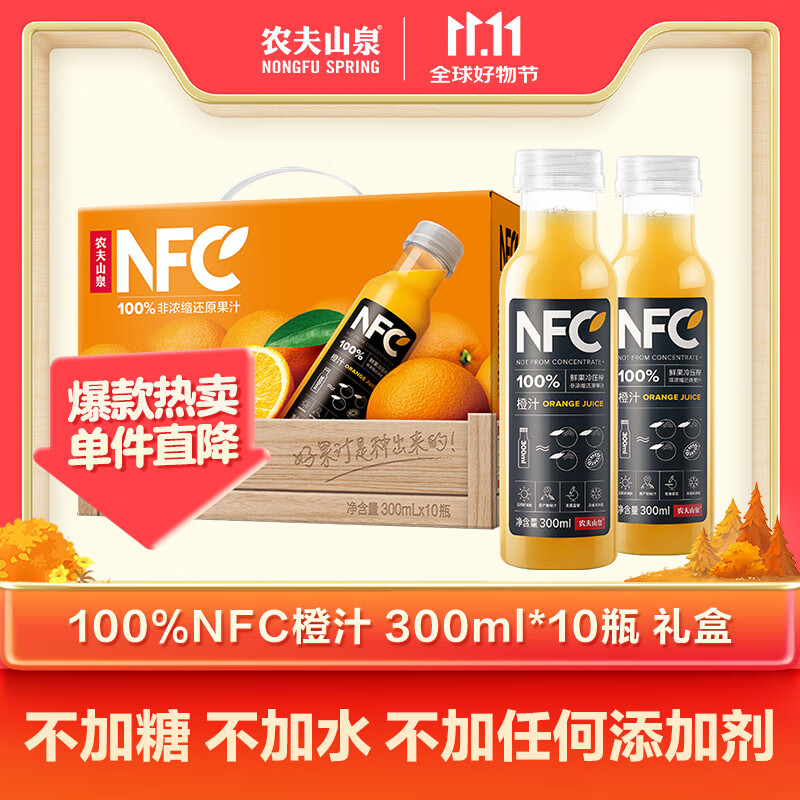 农夫山泉100%纯果汁NFC橙汁300ml*10瓶整箱中秋礼盒鲜果冷压榨0添加剂饮料