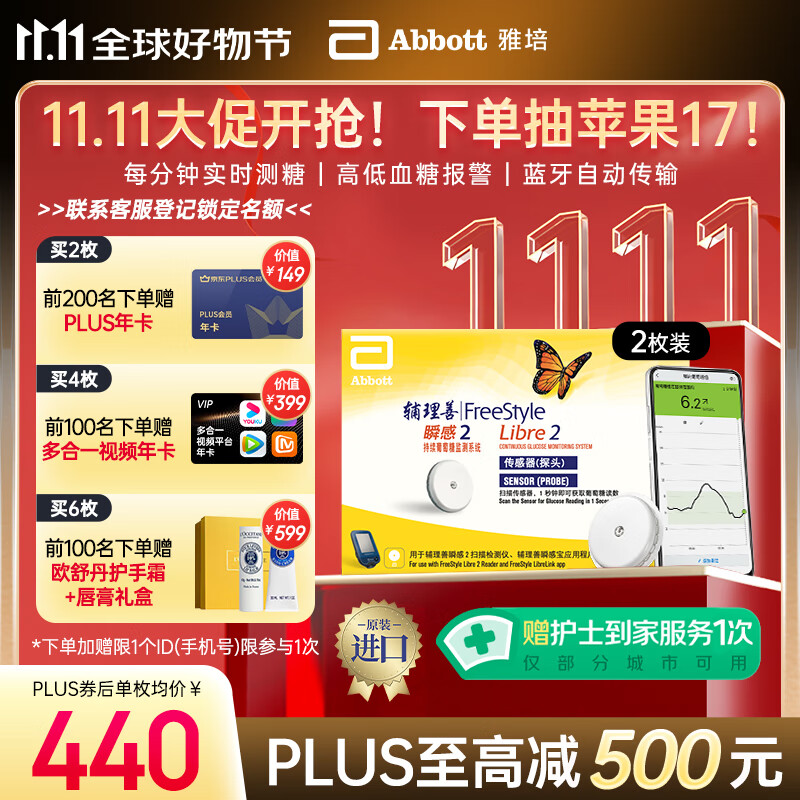 雅培动态血糖仪瞬感2代 免血糖试纸 进口医用高精准血糖动态监测仪2枚