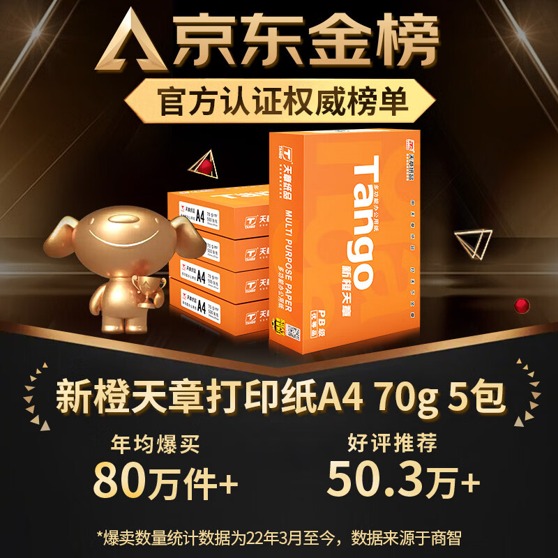天章 (TANGO)新橙天章A4打印纸70g500张*5包【优选品质】整箱2500张 双面打印复印纸 顺滑不卡纸高性价比