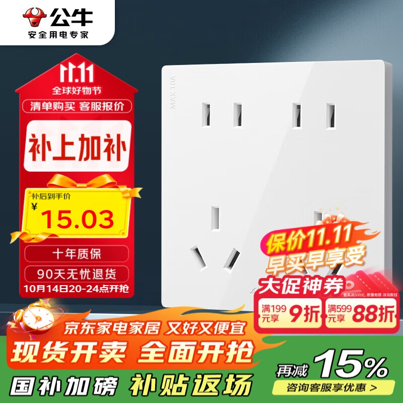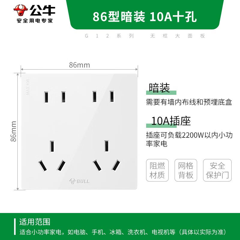 公牛(BULL)开关插座 G12系列 十孔插座86型插座面板 G12Z423 象牙白