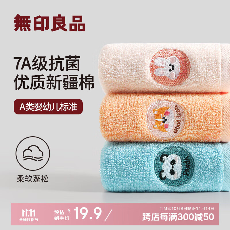 无印良品儿童毛巾3条装7A级抗菌新疆棉A类纯棉柔软亲肤适合宝宝毛巾口水巾