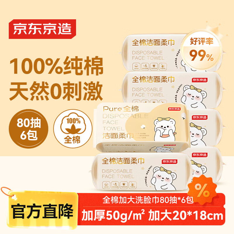 京东京造 一次性洗脸巾全棉80抽×6包 100%纯棉平纹婴儿棉柔巾 纯棉亲肤