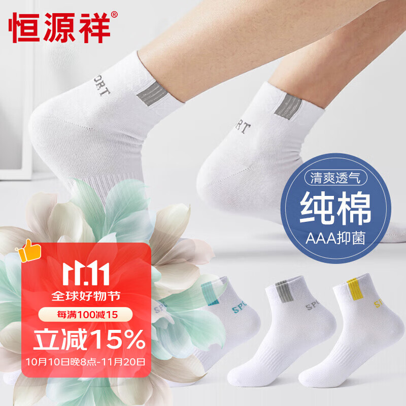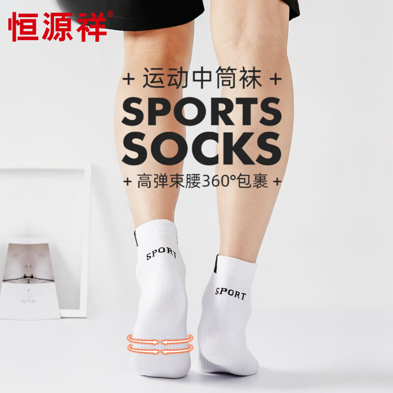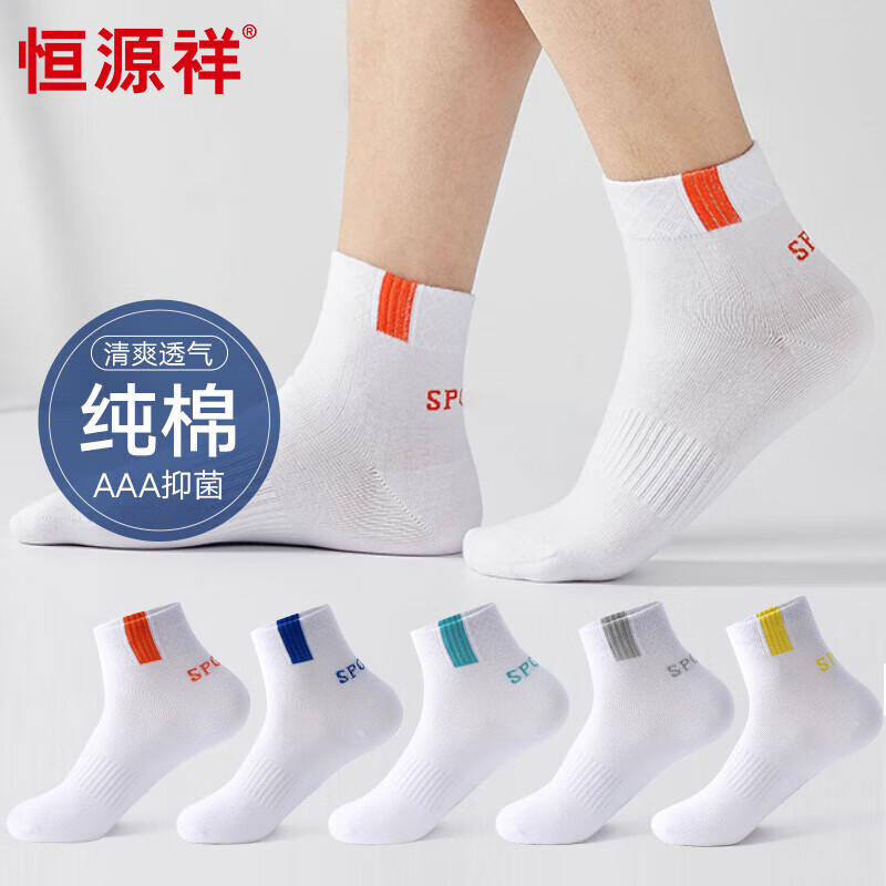 恒源祥袜子男士袜子5双纯棉抑菌中筒袜男式春夏纯白运动袜 纯白5双 均码