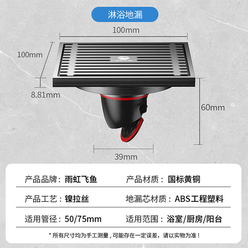 雨虹飞鱼东方雨虹全铜地漏枪灰防反水防臭地漏卫生间大排量下水道淋浴地漏