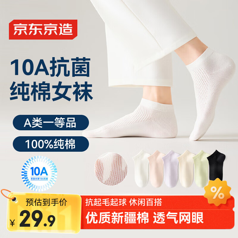 京东京造【10A抑菌】6双女式纯棉袜子夏季新疆棉防臭休闲透气棉短筒袜女