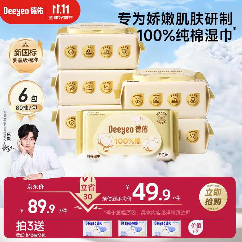 德佑婴儿手口全棉湿巾100%纯棉新生儿湿纸巾洗脸巾大包 80抽6包