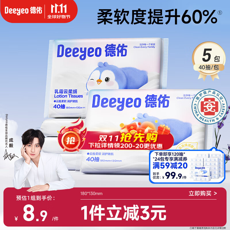 德佑婴儿云柔巾保湿纸巾乳霜纸40抽5包儿童超柔软抽纸便携装