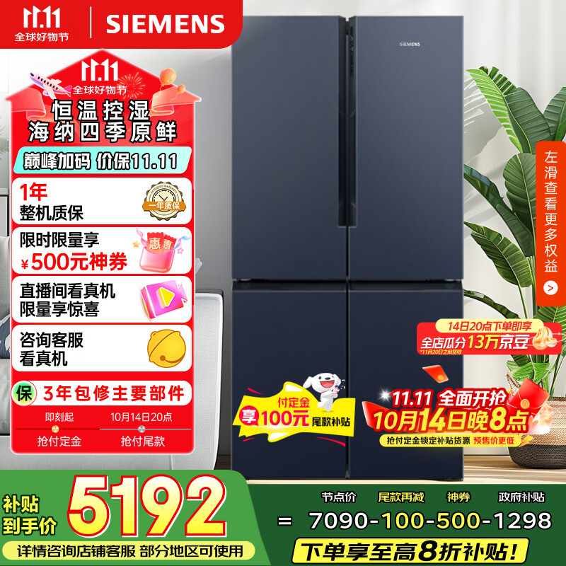西门子(SIEMENS)605升十字四开对开门家用冰箱家电国家补贴 超大容量一级能效无霜冷藏保鲜大怪兽湖蕴蓝K56L56CMEC