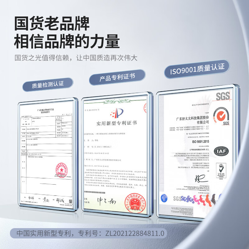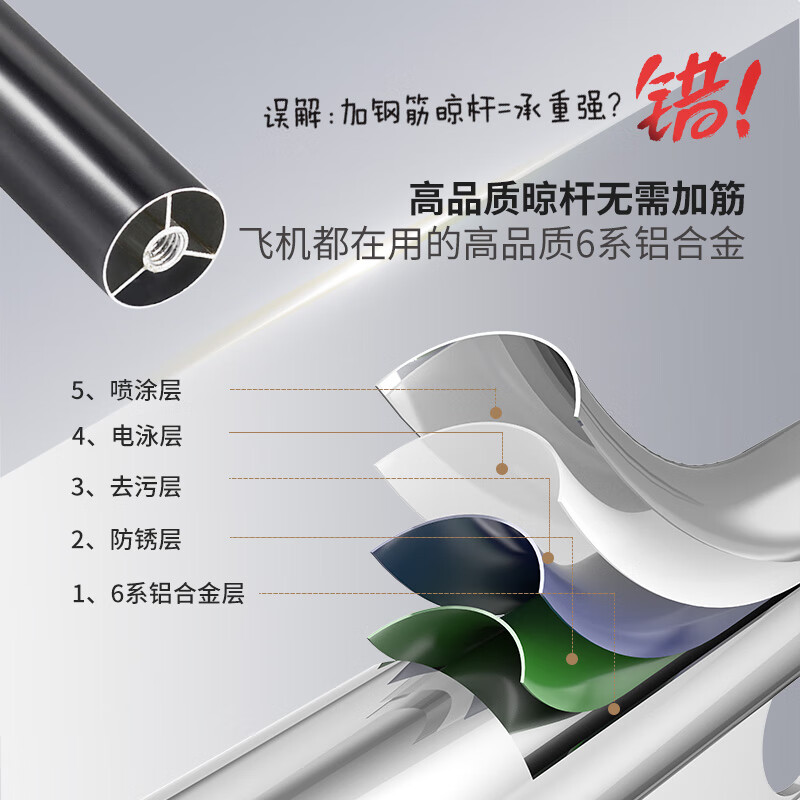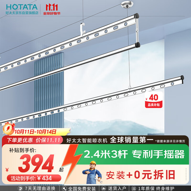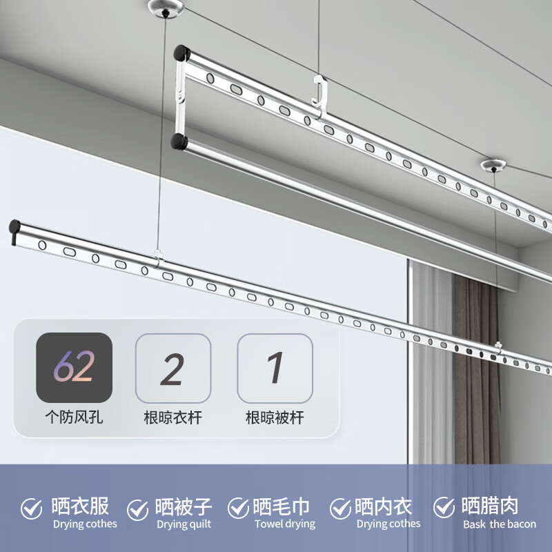 好太太(Hotata)三杆手摇晾衣架阳台室内升降晒衣架铝合金晾衣杆D-1118 2.4米银色