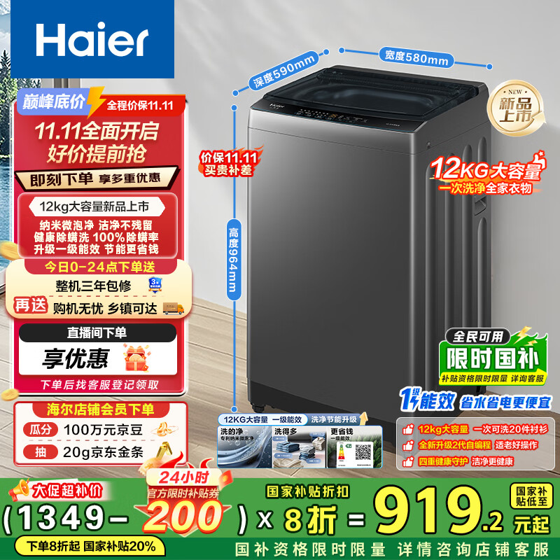 海尔(Haier)全自动波轮洗衣机12公斤大容量家用XQB120-Z10D0京东自营家电国家补贴除菌螨一级能效出租房宿舍