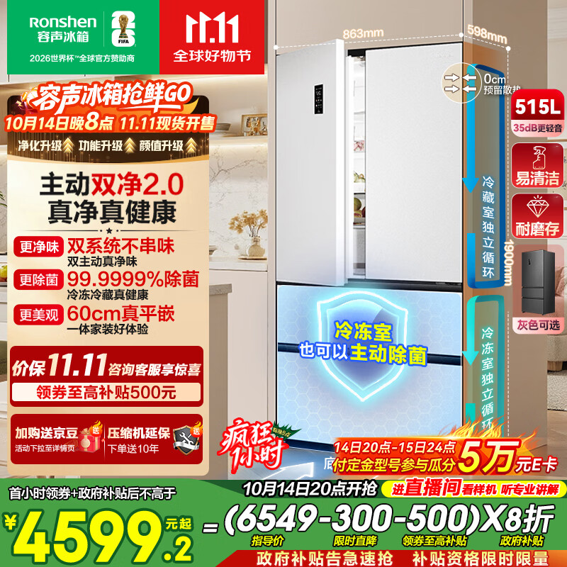 容声方糖515主动双净双系统法式多门四开门超薄零嵌入式电冰箱家用一级能效BCD-515P60FZMAD白国家补贴