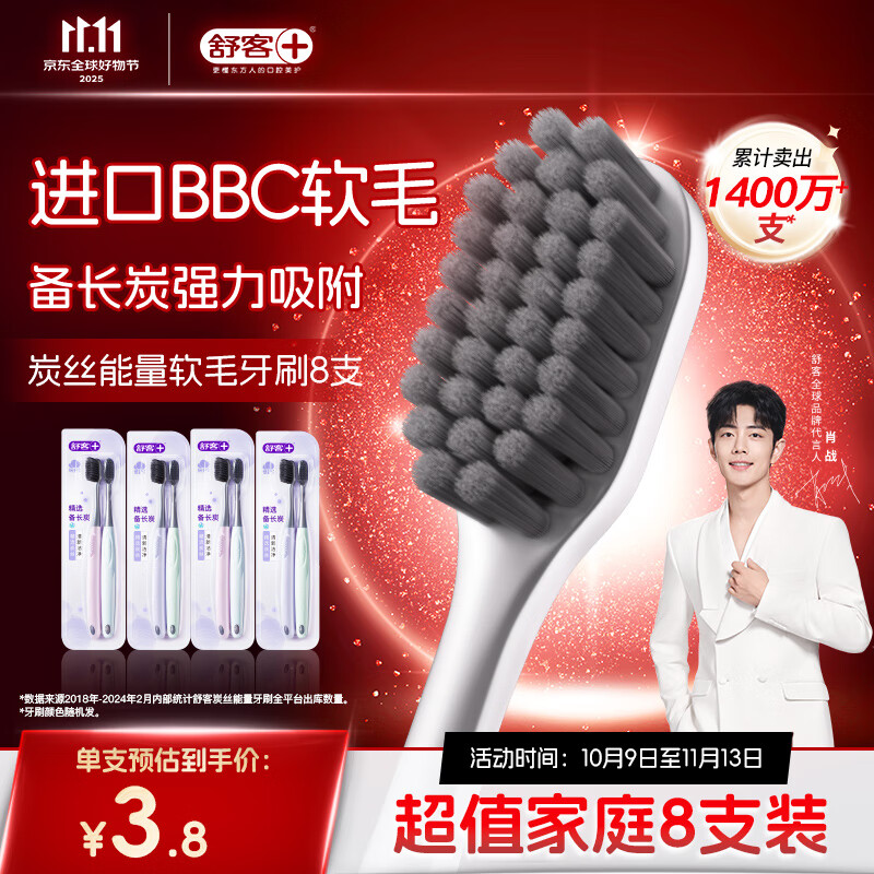 舒客备长炭软毛牙刷8支去异味清新口气成人牙刷小刷头家庭装新老随机