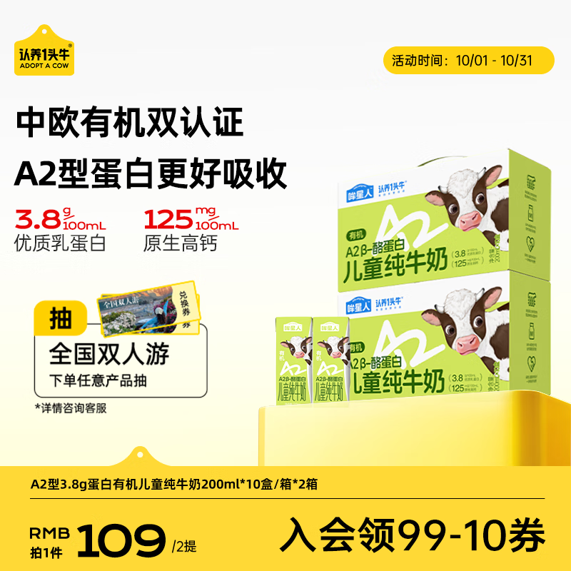 认养一头牛【新鲜日期】哞星人A2β酪蛋白有机儿童纯牛奶/200ml*10盒*2箱