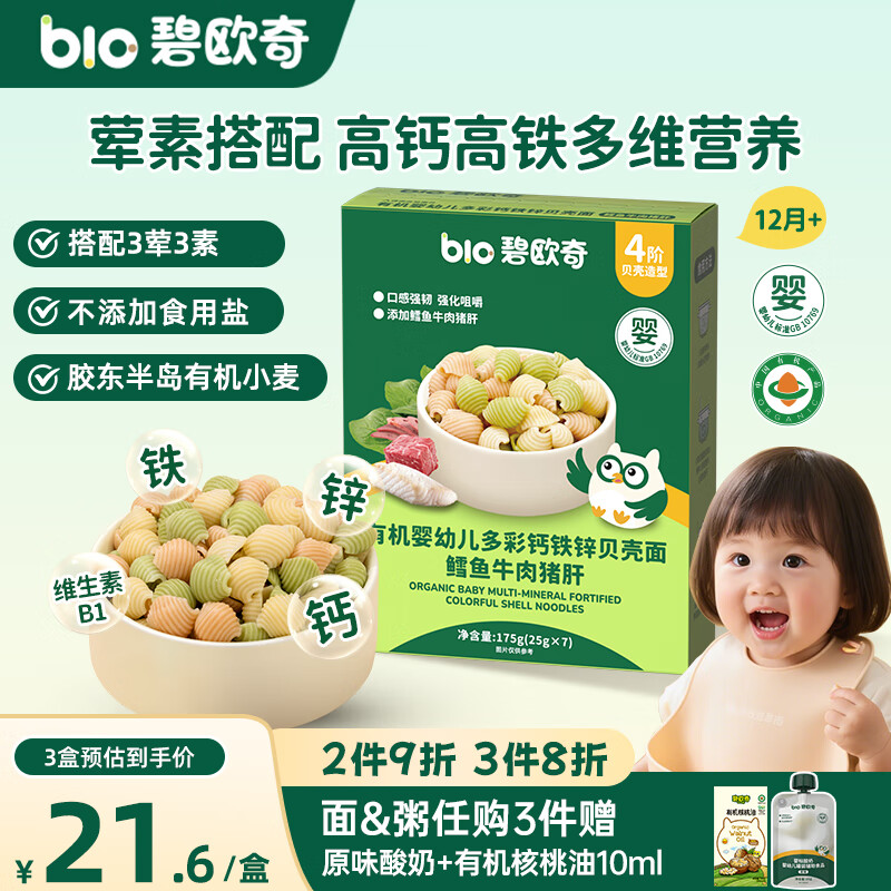 碧欧奇有机婴幼儿多彩钙铁锌贝壳面鳕鱼牛肉猪肝味175g宝宝面条挂面辅食