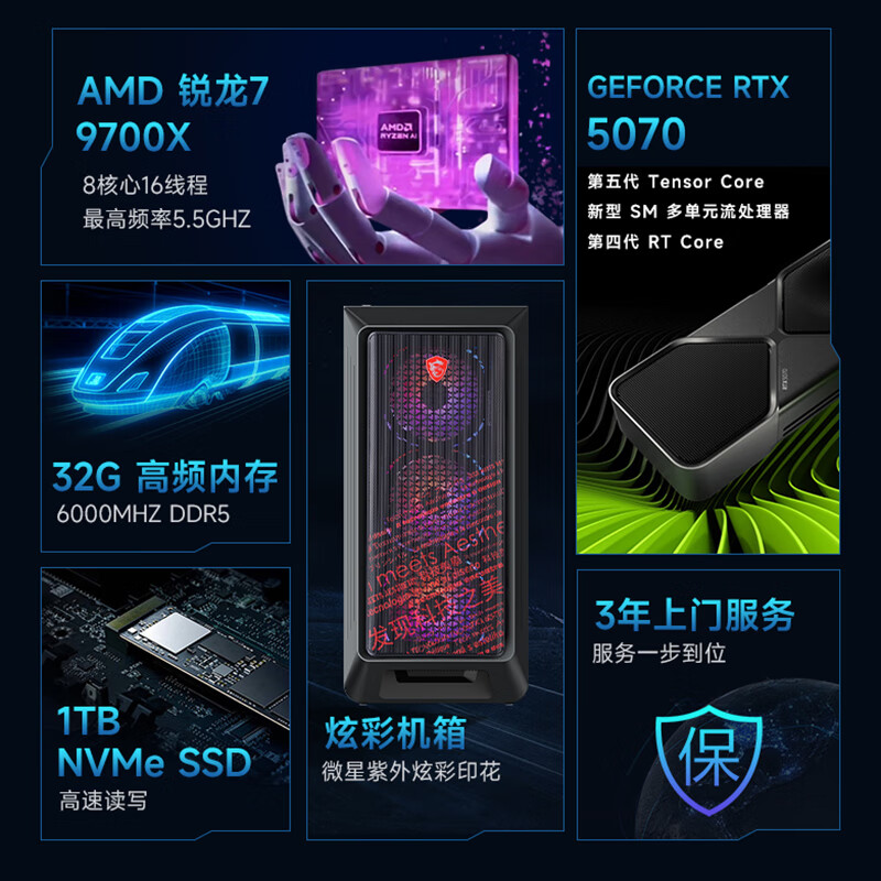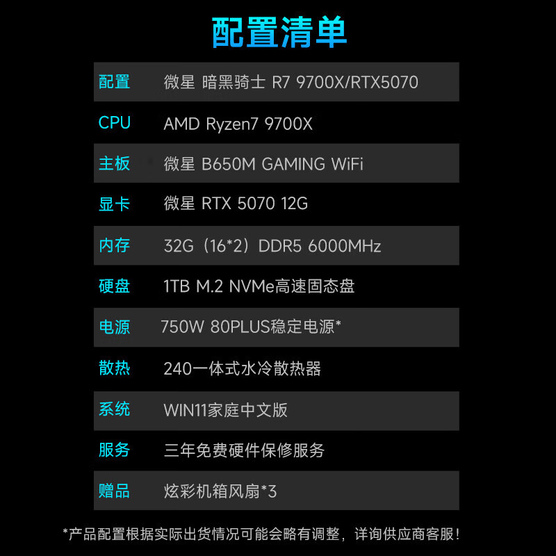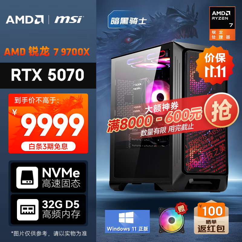 AMD&微星 暗黑骑士 锐龙R7 9700X/RTX5070/32G/1TB黑神话悟空水冷电竞游戏组装台式电脑主机DIY