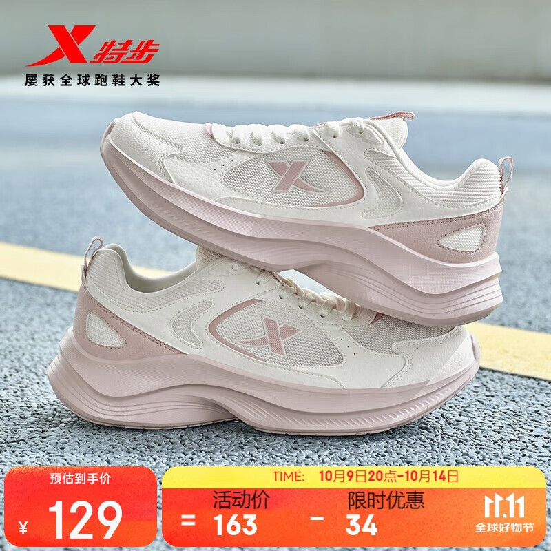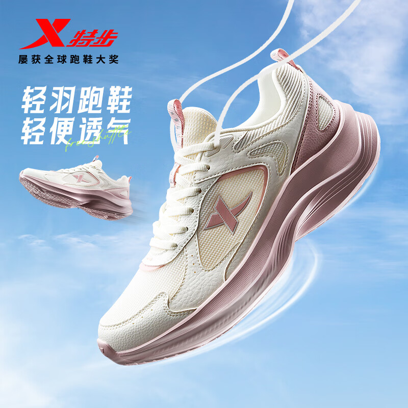 特步女子跑步鞋运动鞋秋季新款网面透气轻便减震休闲跑鞋粉色