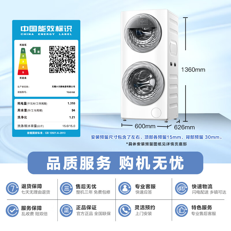小天鹅(LittleSwan)滚筒洗衣机全自动家用【TGG15E】分区双区洗 15公斤 懒人洗衣机 5公斤上筒 家电国家补贴 以旧换新