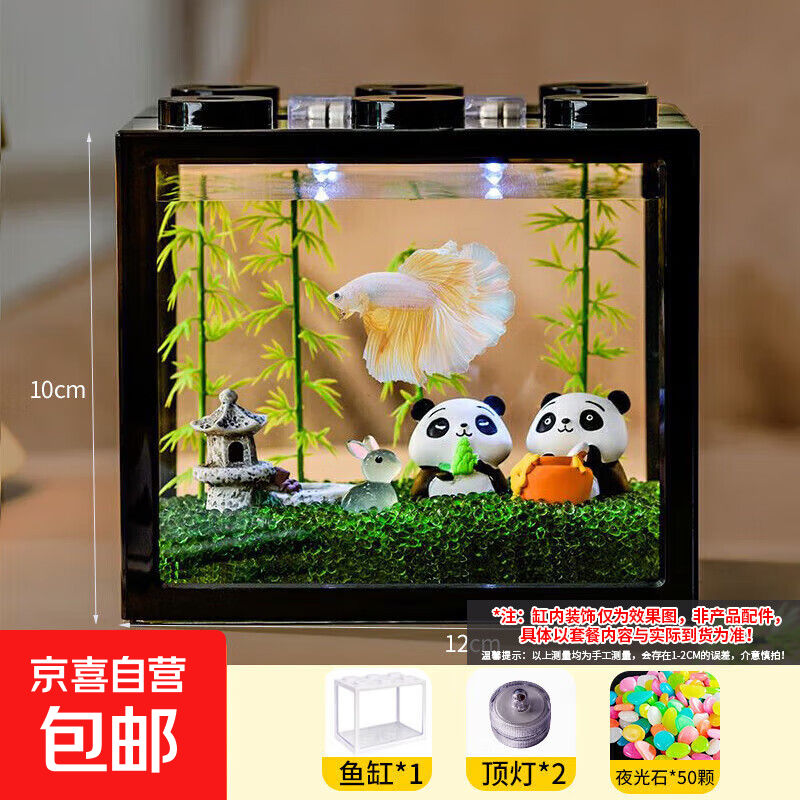 桌面鱼缸小型家用积木缸生态缸水族箱斗鱼缸带小夜灯氛围灯摆件 黑色鱼缸两个灯+小号夜光石约50颗