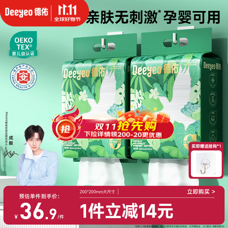 德佑洗脸巾160抽*2提壁挂式加大加厚干湿两用一次性棉柔洁面巾20*20CM