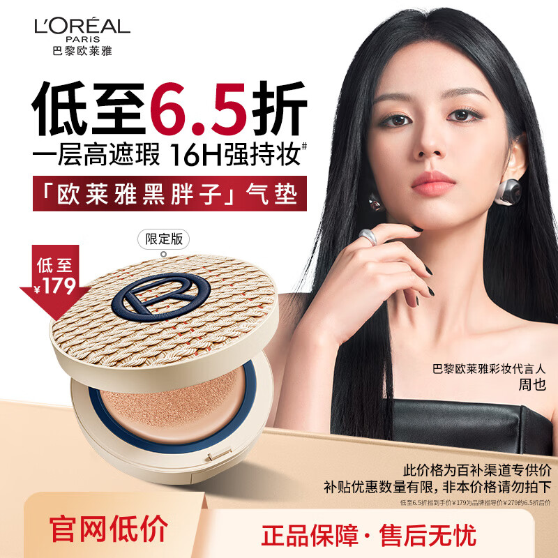 欧莱雅【周也同款】黑胖子气垫编织限定版200自然偏白持久遮瑕控油礼物