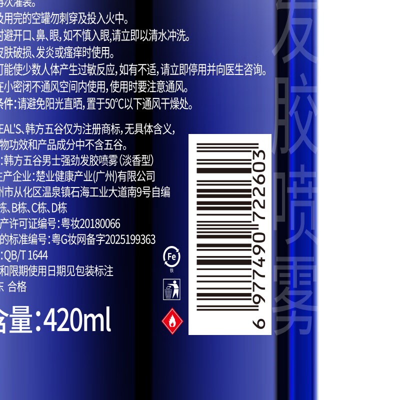 韩方五谷男士发胶清香型定型喷雾持久干胶发泥发蜡自然蓬松速干发喷420ml