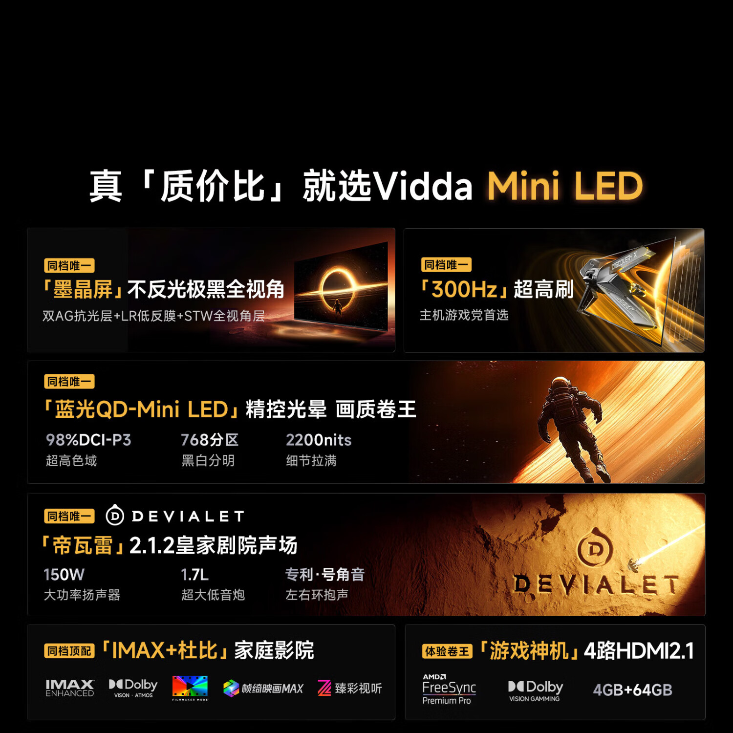 Vidda 发现X 2026款 75英寸【送装一体版】 300Hz超高刷 墨晶屏 QD-Mini LED以旧换新家电国家补贴