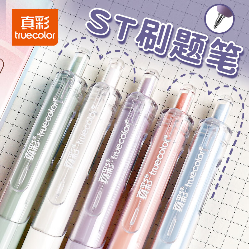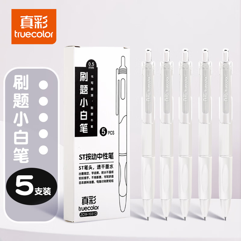 真彩刷题笔专用高颜值速干按动中性笔ins日系ST笔学生用考试笔顺滑0.5笔芯黑色水性签字笔碳素水笔 小白笔-5支盒 0.5mm