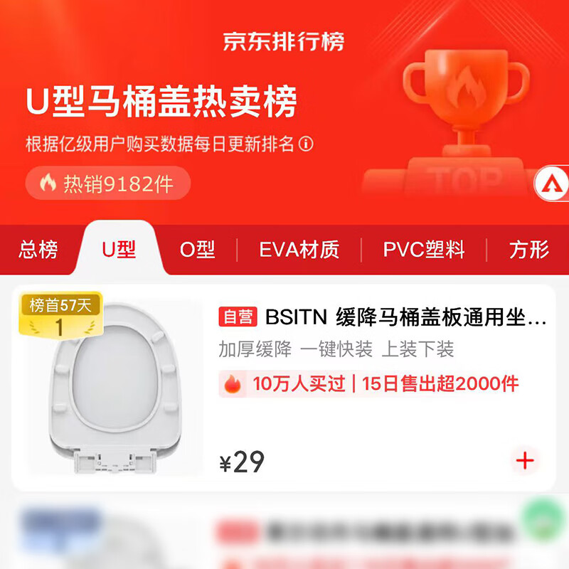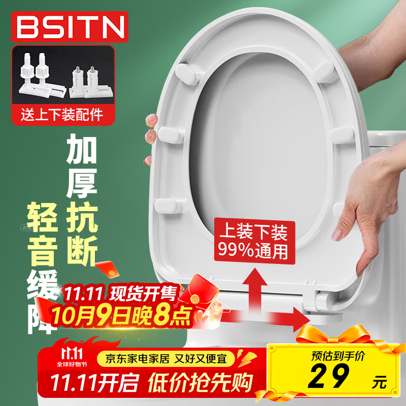 BSITN 缓降马桶盖板通用坐便器盖子U型上下装加厚家用马桶盖垫圈B9051