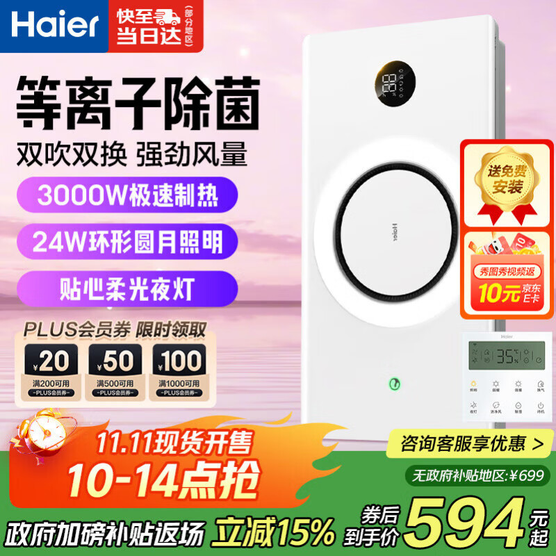 海尔风暖浴霸暖风照明排气一体卫生间暖风机浴室取暖器集成吊顶C360