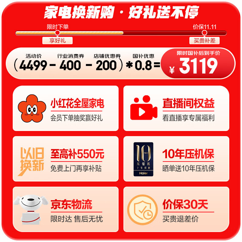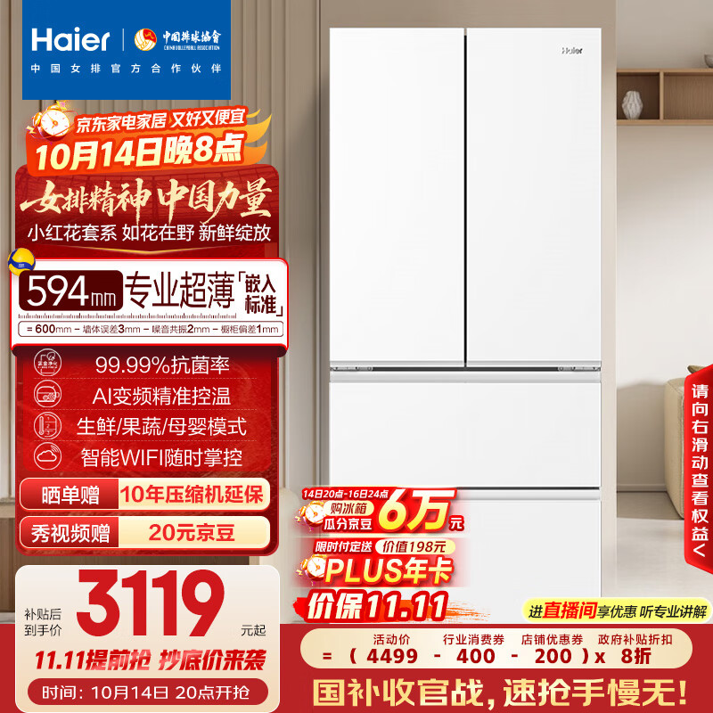 海尔(Haier)小红花-绽放版500升594mm专业超薄法式多门一级能效家用电冰箱BCD-500WGHFDEDWVU1国家补贴20%