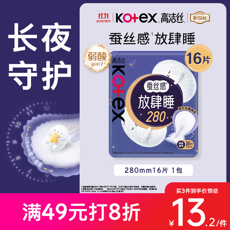 高洁丝【长夜呵护】蚕丝感放肆睡卫生巾280mm16片日用姨妈巾京东自营