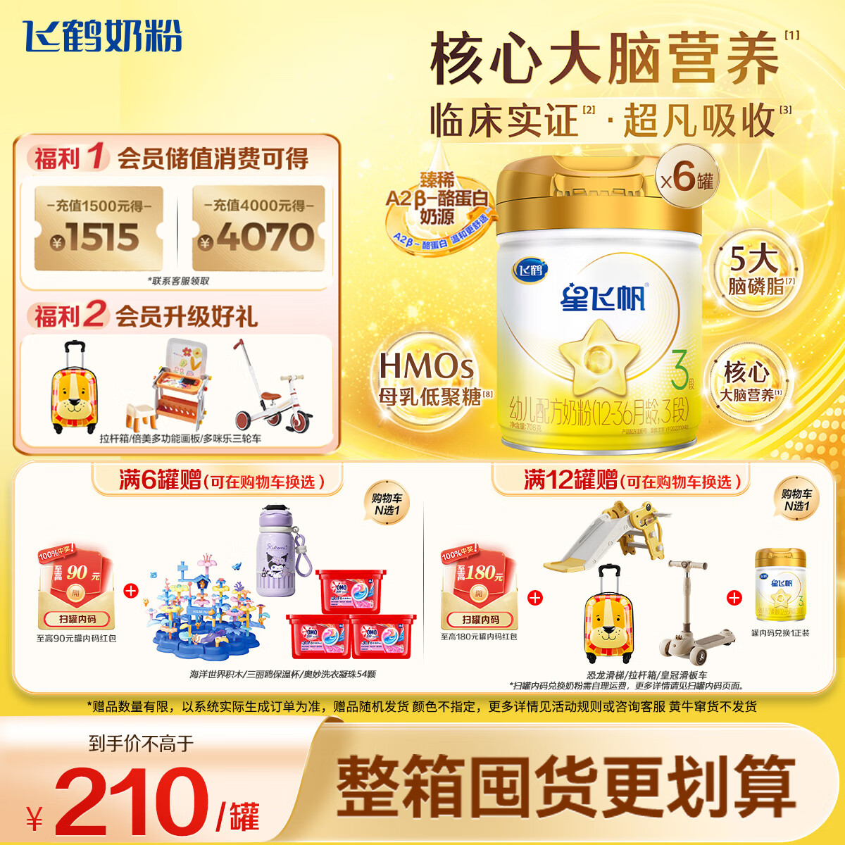 飞鹤星飞帆A2 β-酪蛋白奶源版 幼儿配方奶粉3段(1-3岁) 708g*6