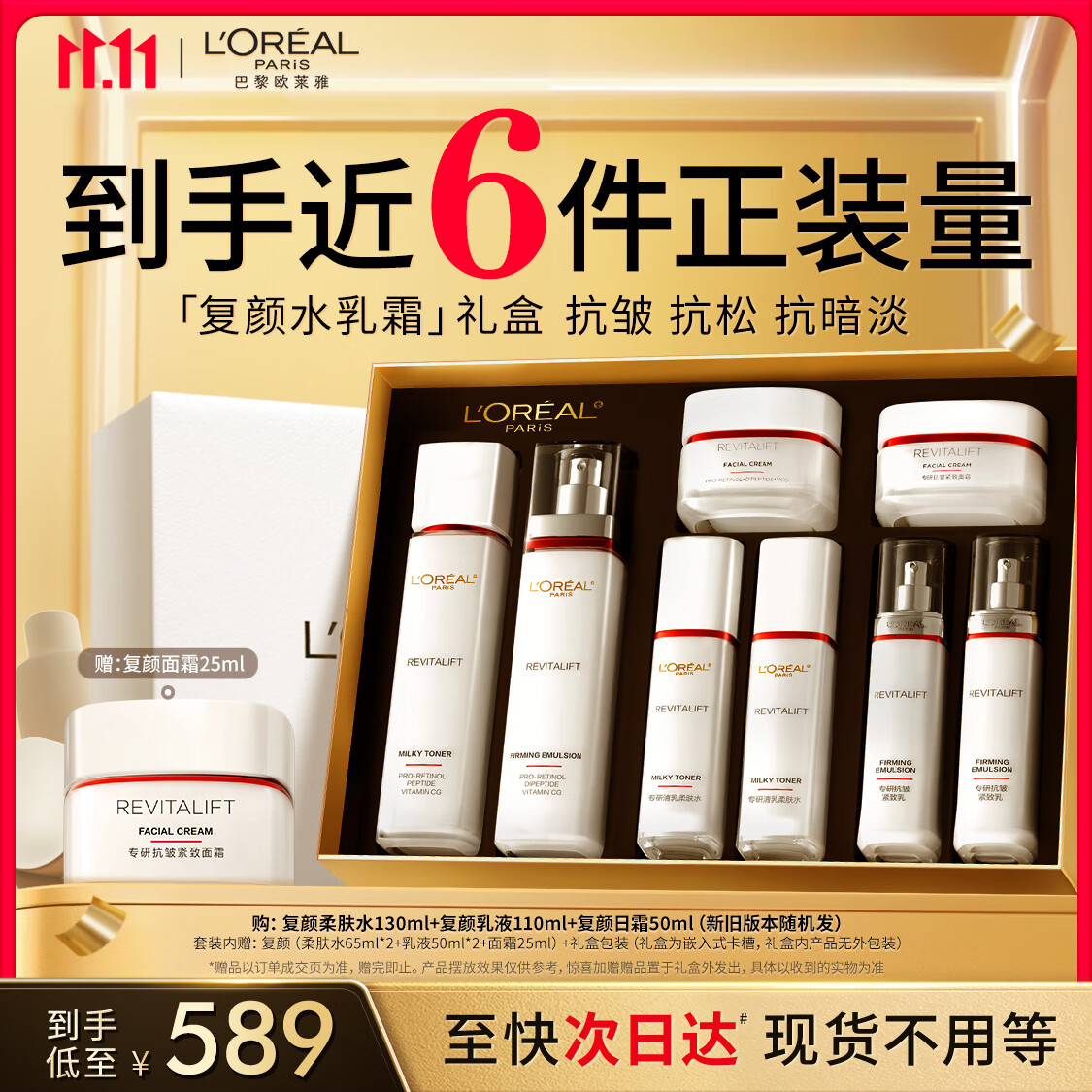欧莱雅复颜水乳霜套装补水保湿抗皱紧致护肤品套装礼盒生日礼物