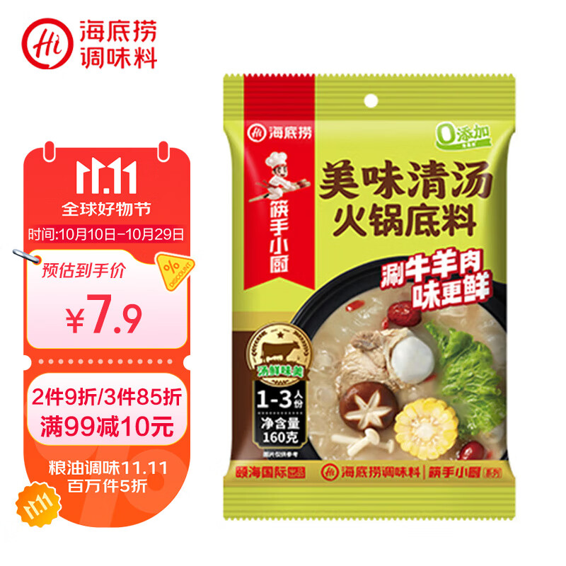 海底捞火锅底料 美味清真牛骨清汤火锅底料160g 0添加 鲜香一料多用