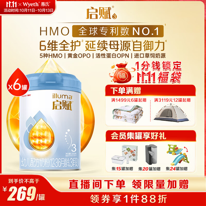 惠氏(Wyeth)启赋蓝钻HMO幼儿配方奶粉3段(12-36月)810g*6罐