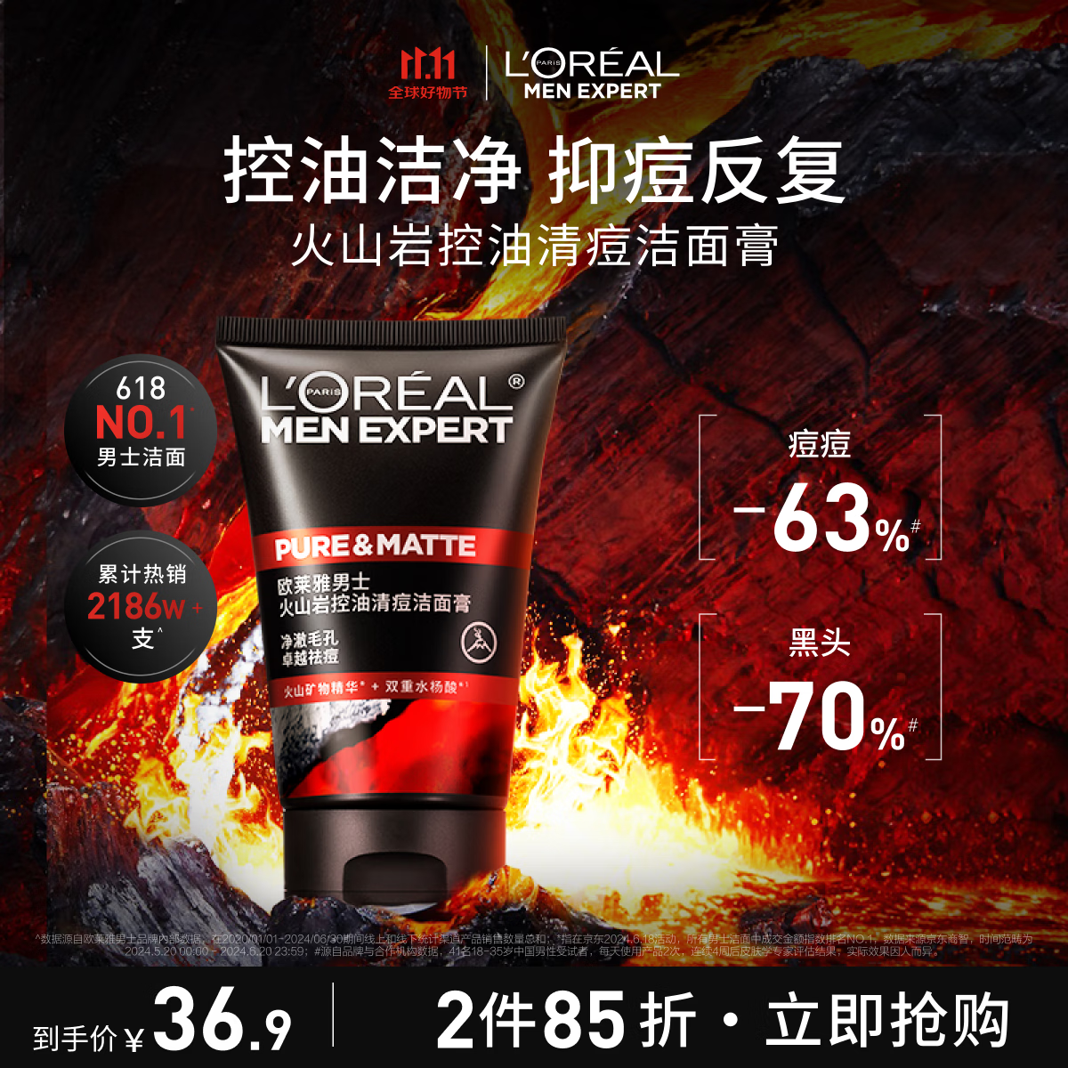 欧莱雅男士火山岩控油清痘洗面奶洁面乳100ml去油祛痘净毛孔护肤品礼物