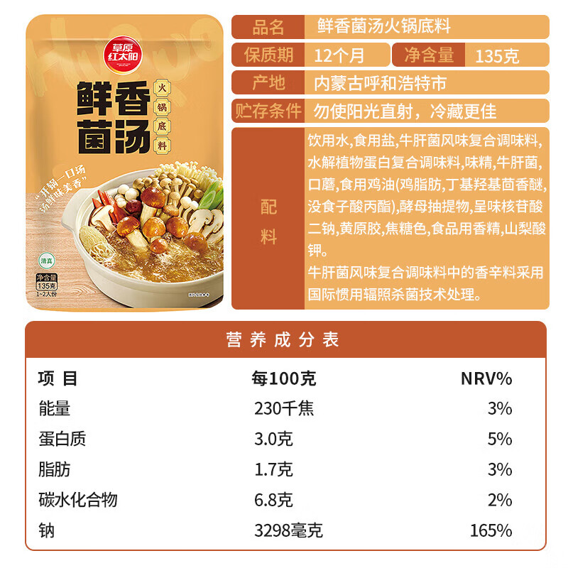 草原红太阳火锅底料 鲜香菌汤火锅底料135g 1~2人份火锅底料 麻辣烫底料