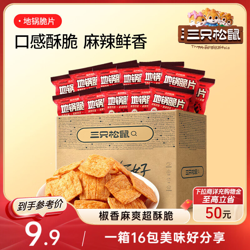 三只松鼠地锅脆片16包/箱 花椒锅巴解馋小吃休闲零食膨化办公室小吃288g