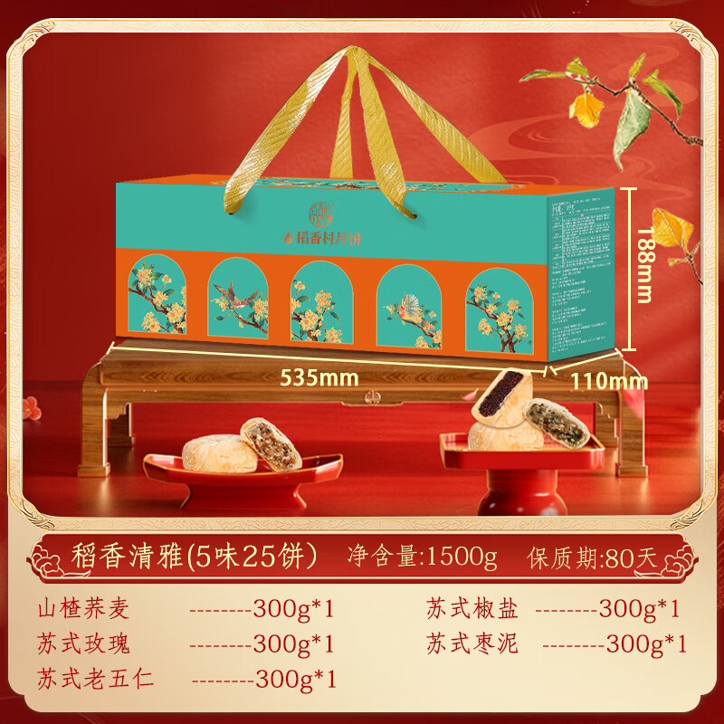 稻香村(DXC)苏式月饼礼盒1500g25饼5味 五仁玫瑰椒盐酥皮中秋节团购 稻香清雅