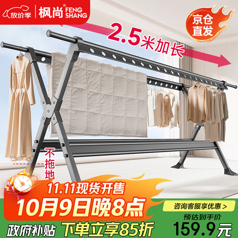枫尚晾衣架落地伸缩晾衣杆免装折叠晒被架加厚铝合金阳台衣架落地立式