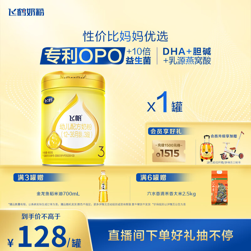 飞鹤飞帆OPO促吸收幼儿配方奶粉3段(12-36月龄)900克DHA好脑力