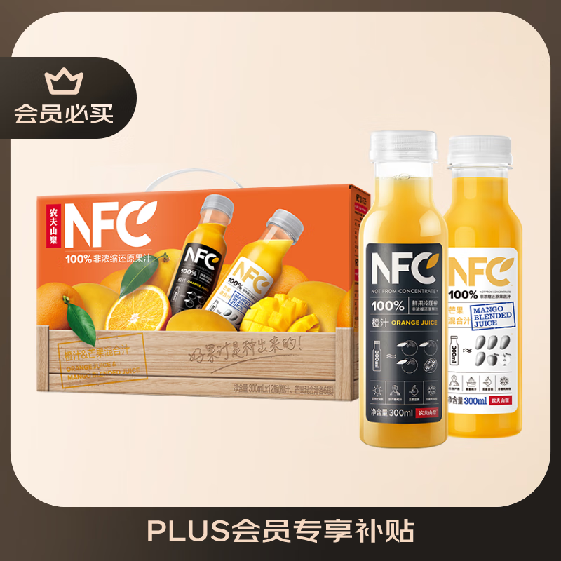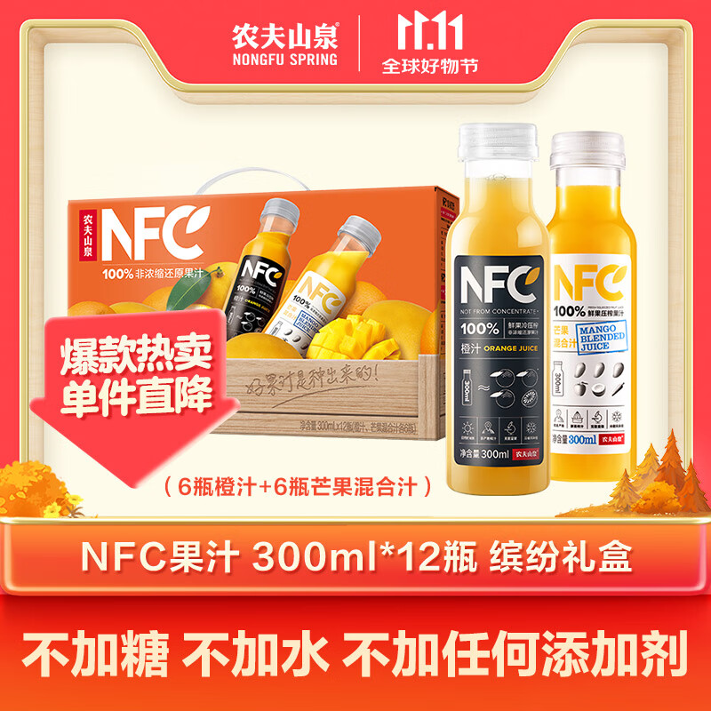 农夫山泉 100%纯果汁NFC果汁300ml*12瓶缤纷中秋礼盒(6瓶橙汁+6瓶芒果汁)