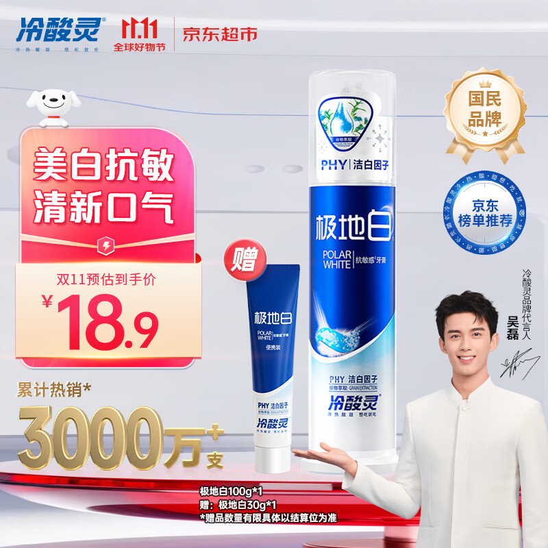 冷酸灵极地白泵式牙膏 抗敏感美白牙齿 海洋薄荷香型 100g【吴磊推荐】