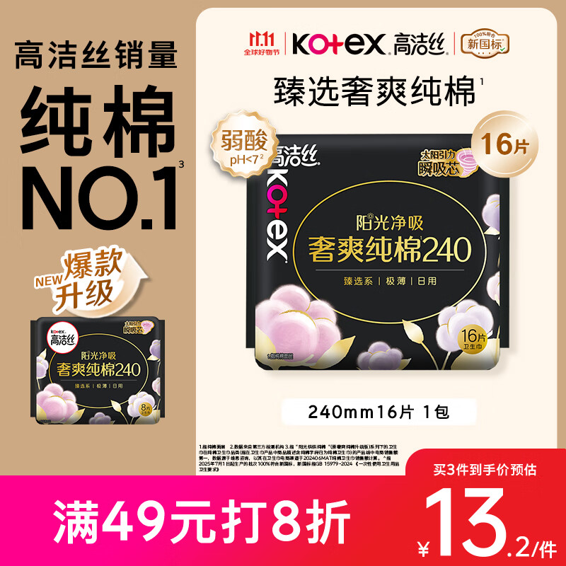 高洁丝【纯棉NO.1】臻选奢爽卫生巾240mm16片日用姨妈巾京东自营旗舰店